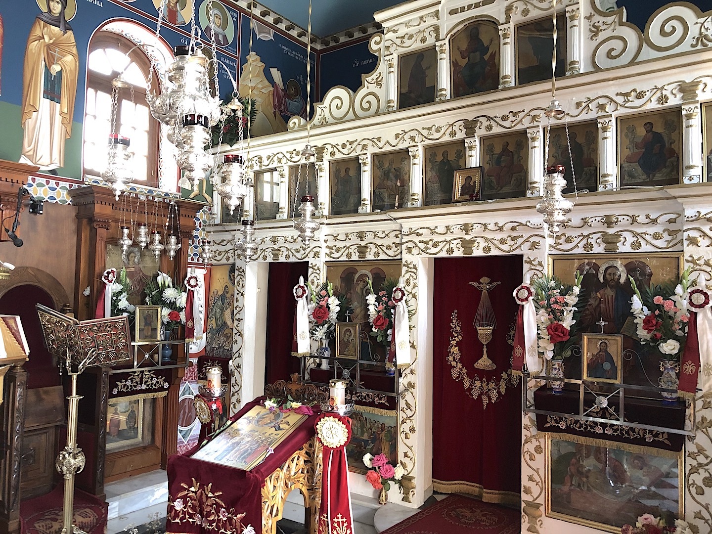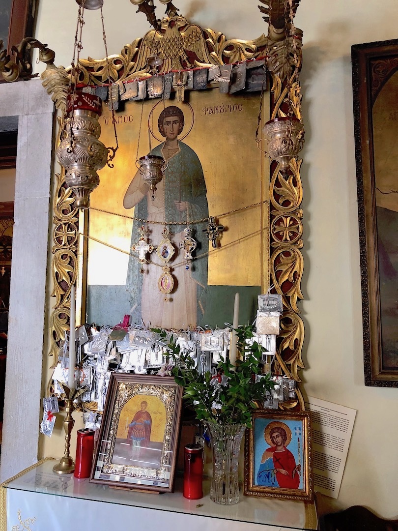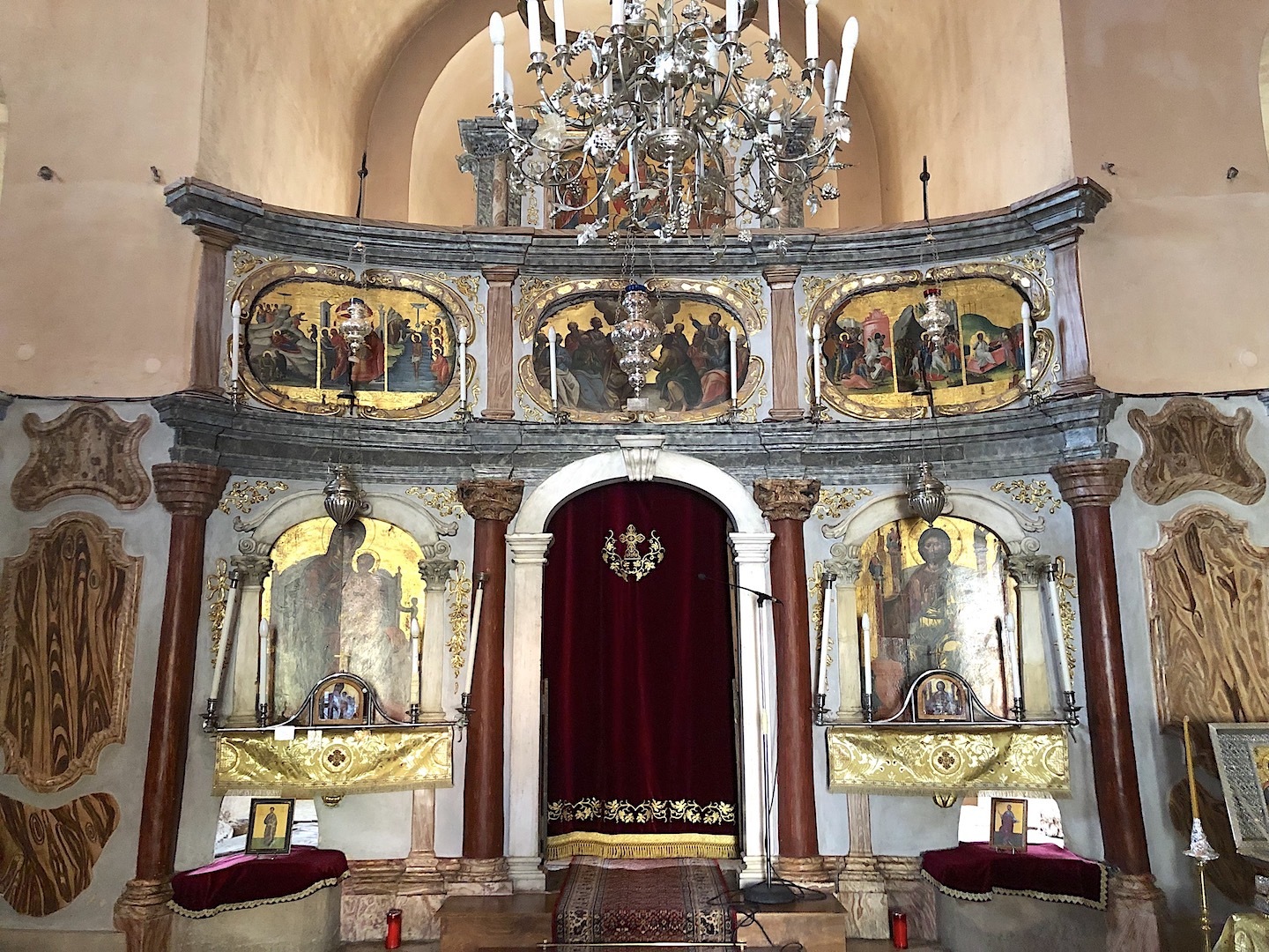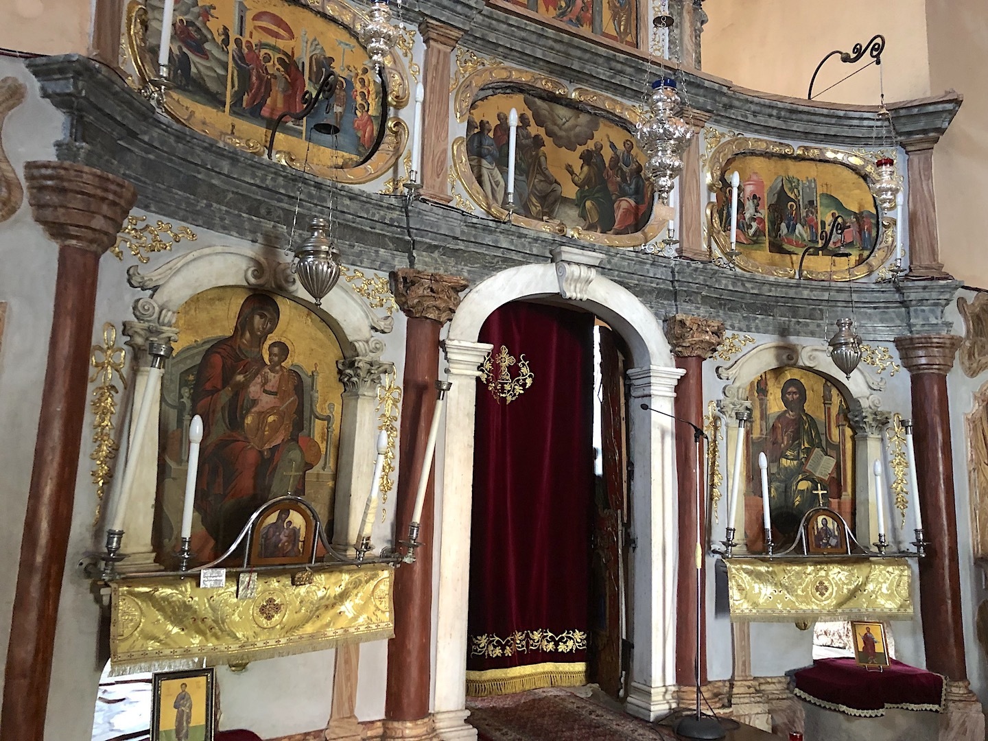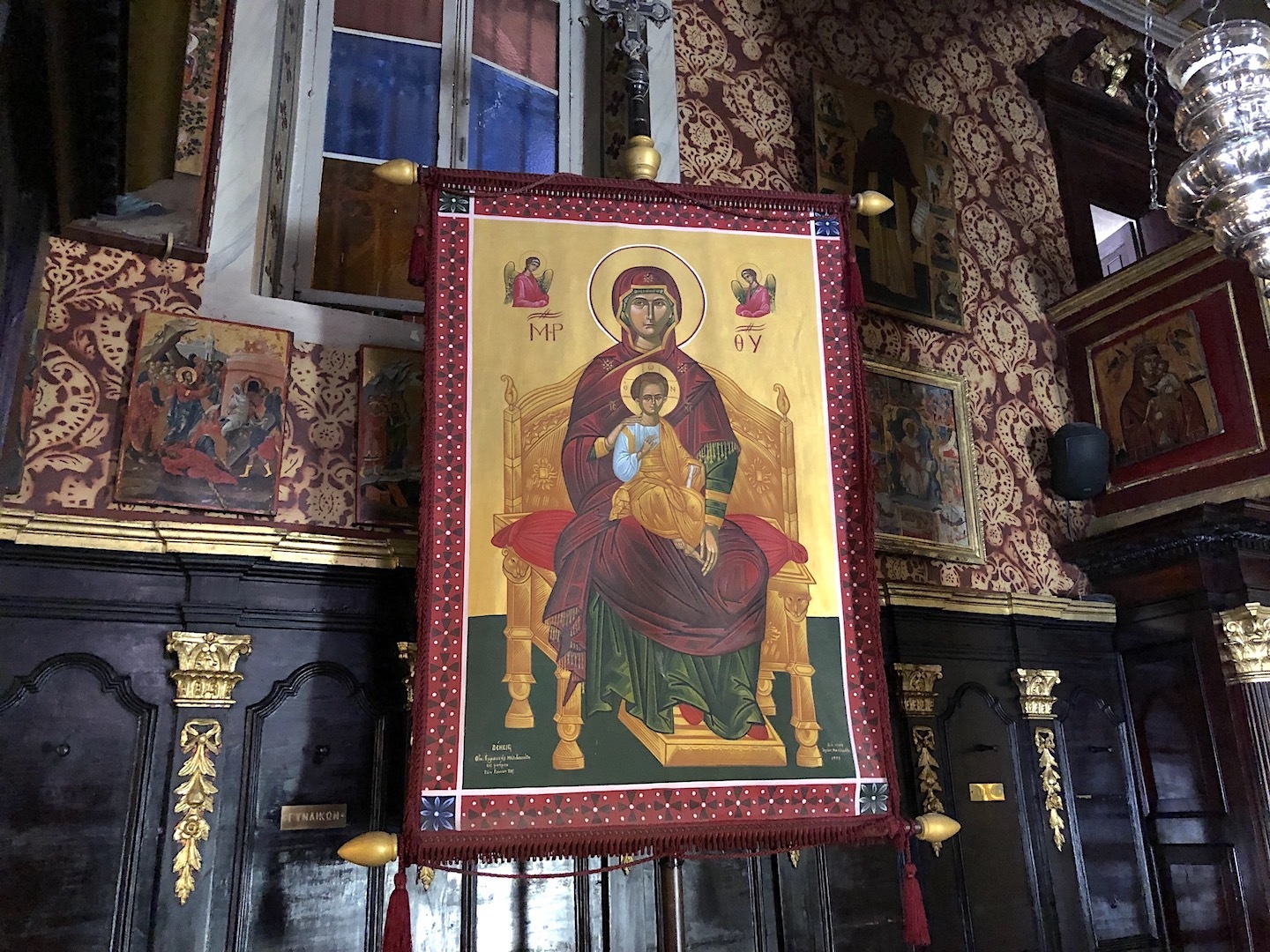 The mural painting differs from the painting in Greek temples and rather resembles Italian frescoes. Undoubtedly, the influence of Venice is felt. Huge gold and silver panicadils, a marble iconostasis, unusual-looking icons-medallions in gold frames on the vault. They represent scenes from the life of the Saint, the Evangelists, and other similar themes and images. The ceiling of the temple was made by Panagiotis Doxaras (1662-1729), one of the founders The Ionian School of Art, which was influenced by the Renaissance. The artist studied in Rome and Venice and was a great admirer of Tintoretto, Titian, and Veronese. In 1750-1755, a number of works were performed by Spiridon Sperantsas. The original icons and other church paintings by Doxaras were destroyed by the dampness, and their place was taken by copies made by Nikolaos Postpotis in 1851-1852.